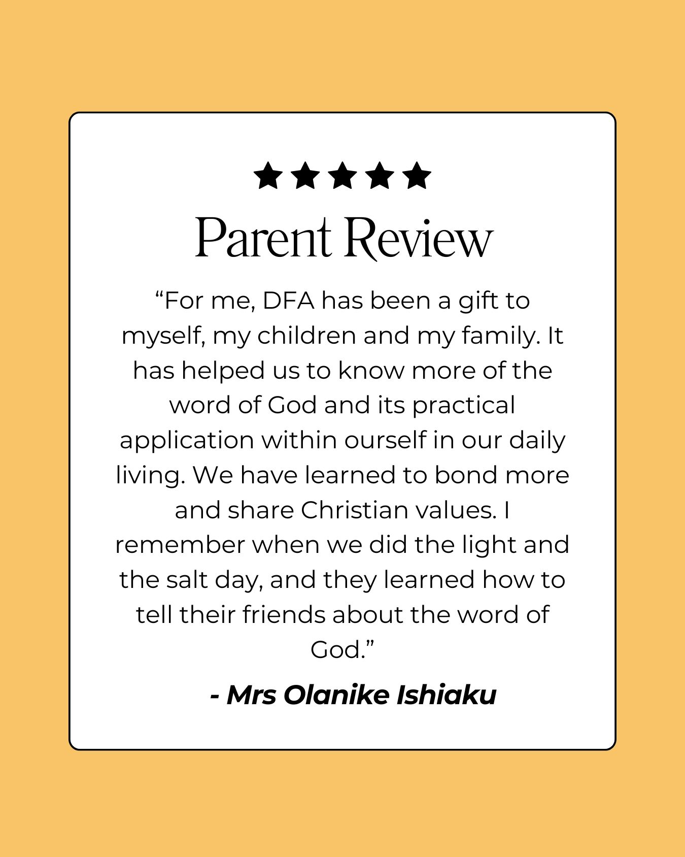 Through DFA, Oluwatoyin Oboh is fully committed to helping families raise strong, confident, Spirit-led children who know their identity and live for God’s kingdom.